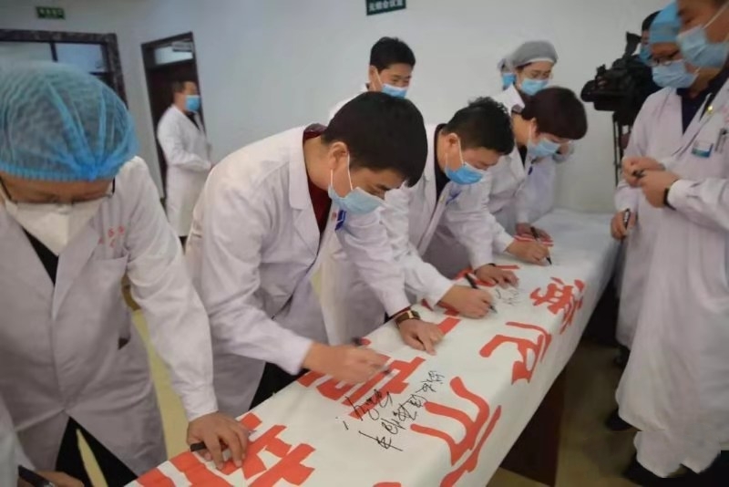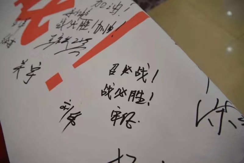 隨後,全體人員在請戰條幅上簽名請戰,「召必戰、戰必勝」、「義不容辭、不辱使命」、「保證完成任務」、「加油我的戰友」......一句句話語彰顯了大家不忘醫務人員初心,牢記健康守護使命的信心和決心。