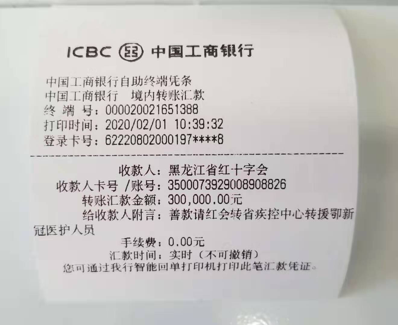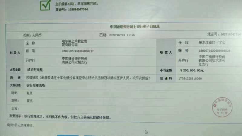 據了解,黑龍江省交通投資集團黨委書記、董事長尚雲龍代表企業捐贈50萬元;國家一級演員、全國青聯常委、黑龍江省青聯名譽副主席劉和剛捐贈30萬元;哈爾濱上禾牧業有限公司董事長賈樹春捐贈20萬元;北京黑龍江慶安企業商會會長齊國慶捐贈10萬元,累積捐贈110萬元人民幣,此善款將通過黑龍江省疫病預防控制中心轉出,用於援助黑龍江省援鄂抗擊新冠肺炎疫情的醫護人員,希望能夠切實幫助一線醫務人員抗擊疫情。