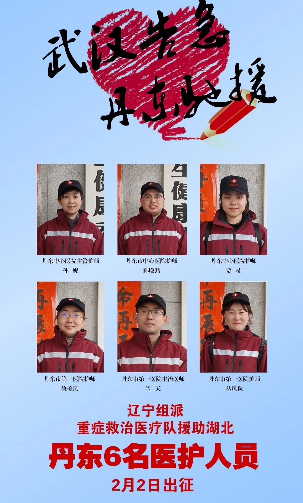 據了解,此次出征湖北的醫療隊是按照遼寧省衛健委下發的緊急通知,迅速組建的重症救治醫療隊,共6名醫護人員,分別是丹東市中心醫院護士長孫妮(隊長)、護士孫殿鵬、賈楠,丹東市第一醫院重症醫學科醫生蘭天、護士修美鳳、叢鳳秋。