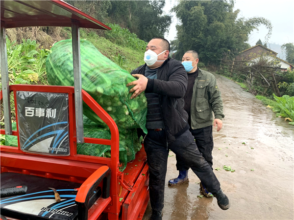 此時的羅咀村和往年一樣,青菜長滿了田間地頭,「接到村委會通知我們就開始幹了,我們家今天裝了一千斤青菜上車,」羅咀村村民彭燕君軍告訴記者,他和妻子從2月1日下午開始收割地里的青菜,今早就收齊了一千斤。
