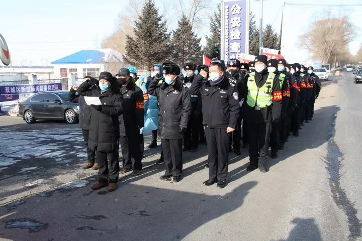 為進一步鼓舞士氣,2月2日,在蘭棱檢查站舉行「蘭棱檢查站聯合黨支部抗擊疫情宣誓儀式」。在儀式上,由雙城公安分局黨組成員、副局長李樹智到會講話、授旗,並由雙城區衛建局副局長於春永帶領聯合黨支部黨員面對黨旗宣誓。