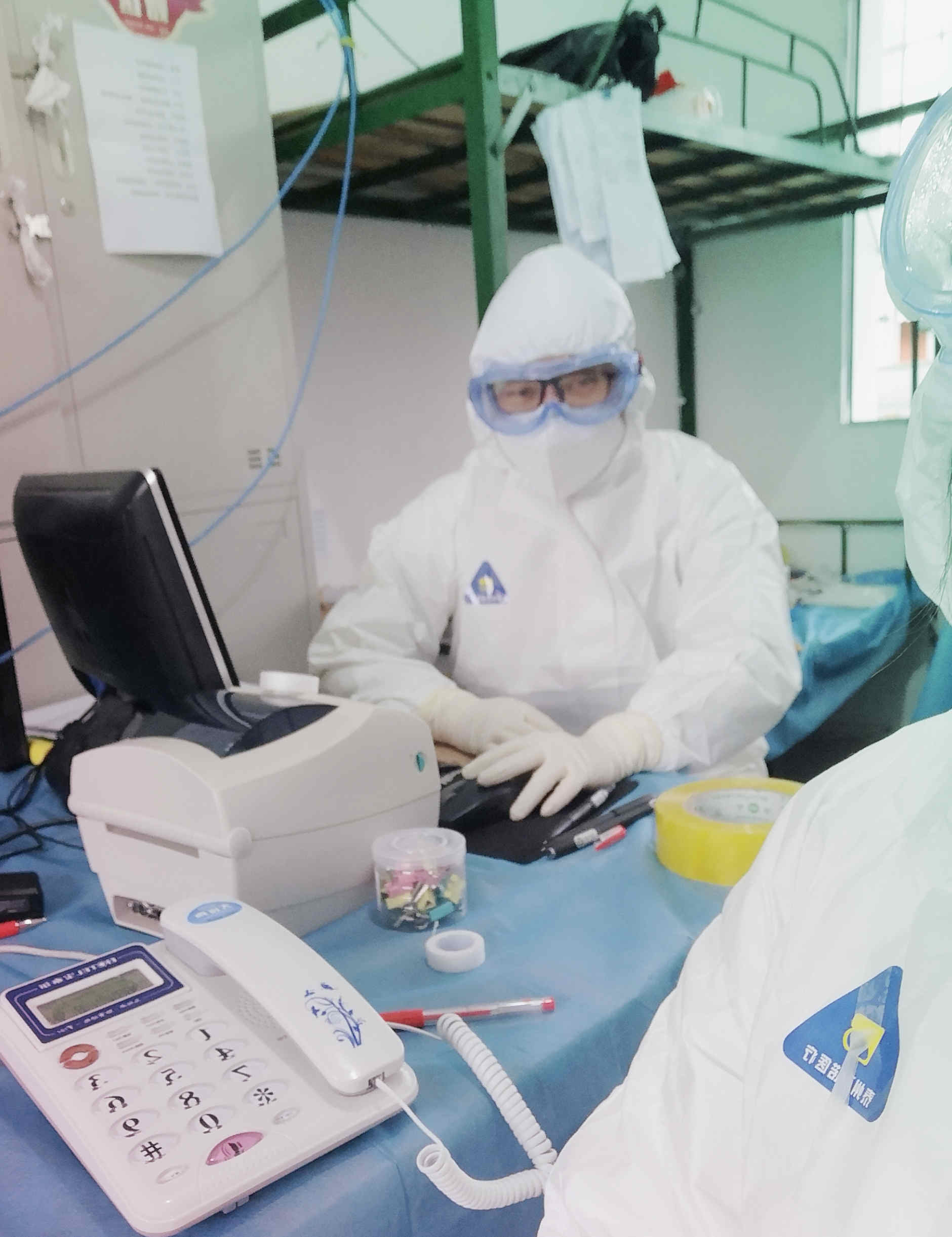 病房內,正在查房、做輸液前的校對的醫護人員穿着厚厚的防護裝備,眼罩、口罩上凝結的水珠和鼻樑、臉上留下的一道道深深壓痕記錄著一天的忙碌,穿一次性隔離衣、戴兩層隔離帽、口罩、眼罩、鞋套,再帶上兩層乳膠手套,袖口用透明膠帶封死,防護服厚重,穿脫起來費時費力,為了節省上廁所的時間,醫護人員甚至不敢喝水。
