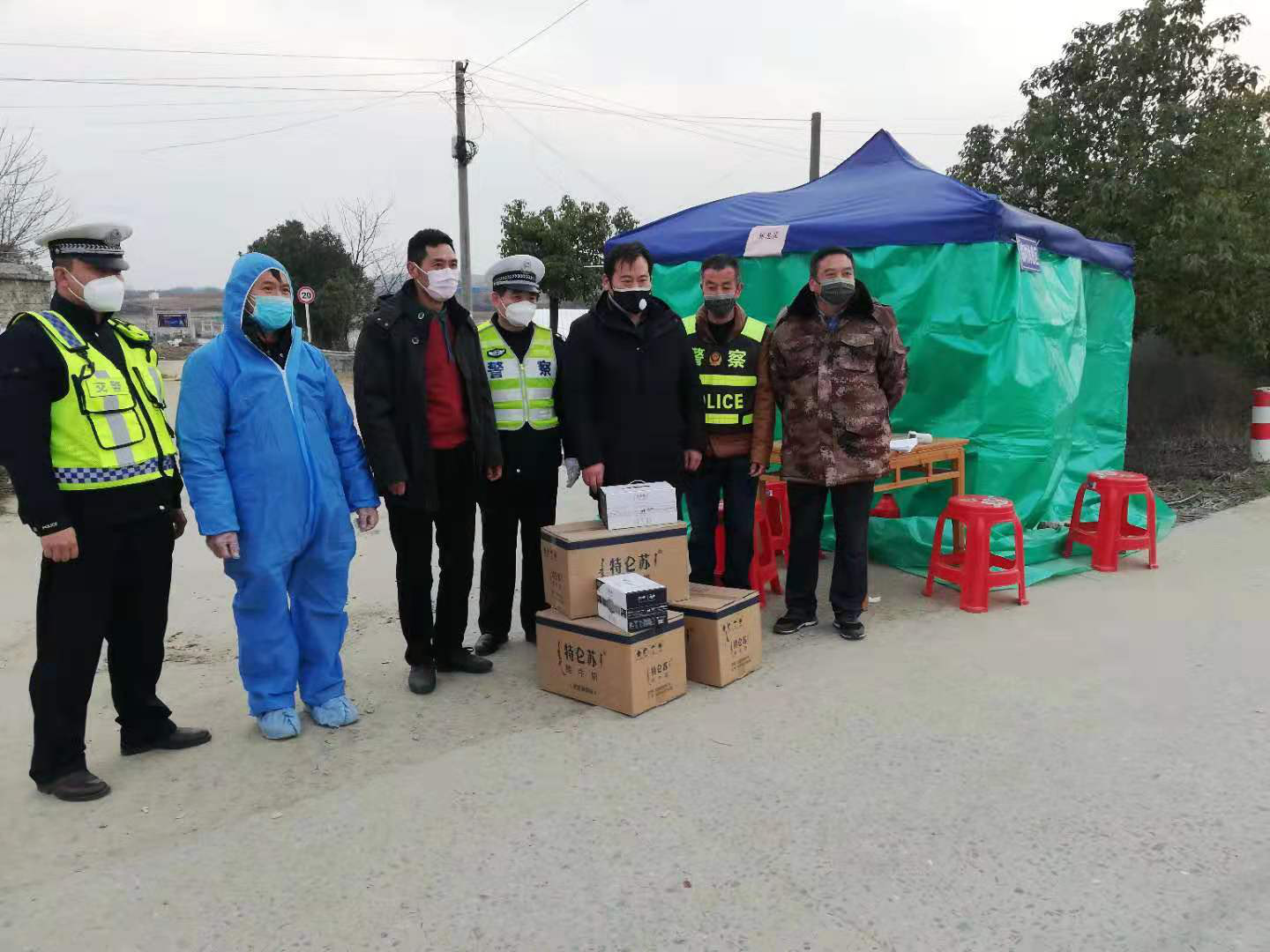 隨後,便從後備箱搬下來幾大箱牛奶。夏忠軍說:「在這個緊急關頭,總想為『一線』的工作人員做些什麼,思來想去決定送幾箱牛奶,讓卡點上的工作人員補充點營養!」天氣雖冷,但卡點的工作人員心是熱的,是暖的。