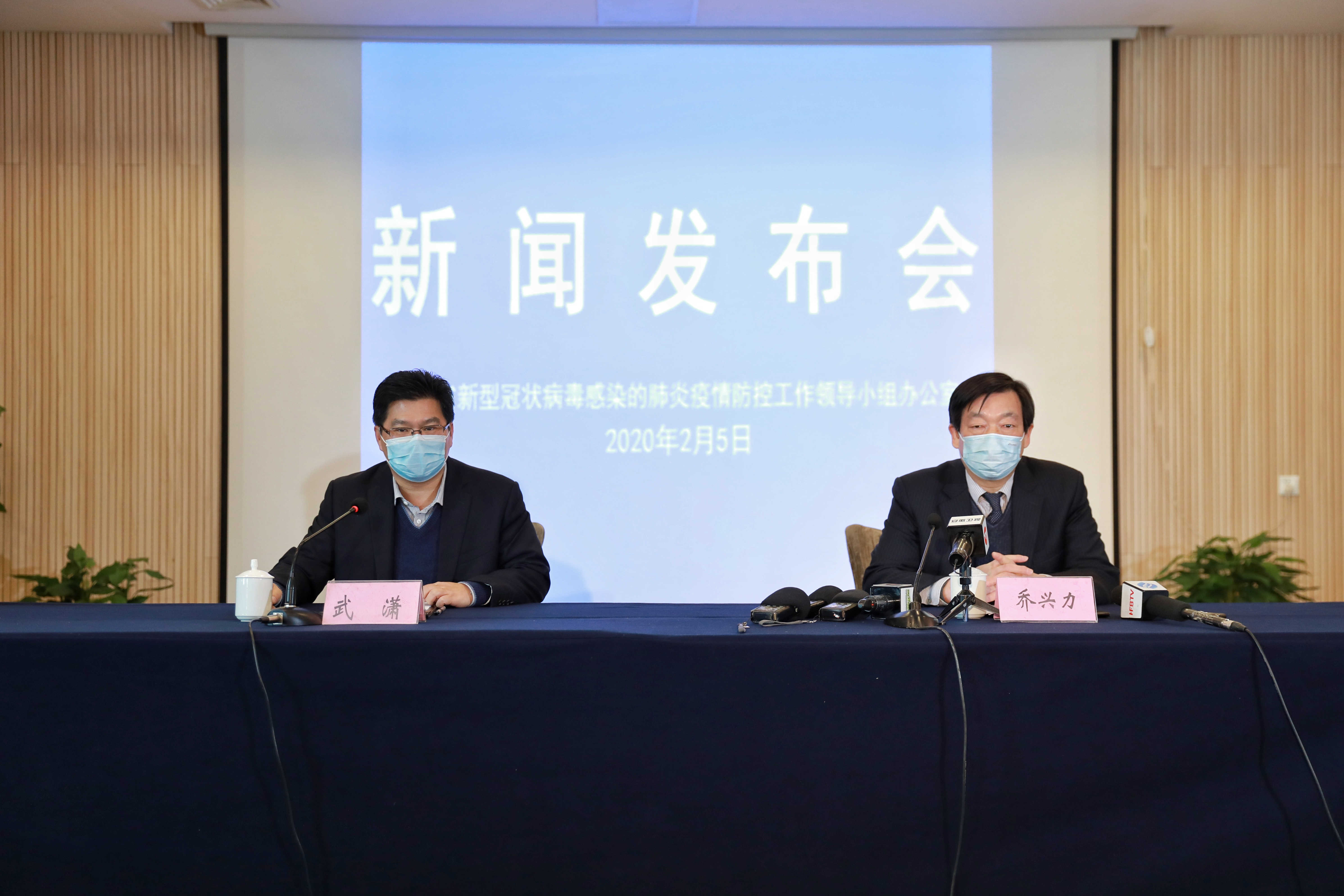 發佈會現場,安徽省委宣傳部新聞發佈處處長武瀟主持發佈(左),省商務廳副廳長喬興力介紹生活必需品情況,並回答記者提問