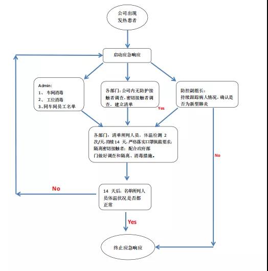 疫情就是命令!我通知河南工廠留守公司的幾位骨幹啟動應急機制,由行政通知每一個員工在家自行隔離,每天早上和晚上報體溫,如有發燒、咳嗽等症狀立即報告。同時我要求工廠向縣裏防疫指揮部報告病人和接觸人員名單,同時建議對員工賈某立即隔離治療。當天工廠採購消毒和防護用品包括體溫計,每天對廠區進行消毒和留守人員測量體溫。元月28日公司下發《新型冠狀病毒防控指南》,要求各公司、部門、辦事處嚴格執行,開工時間推遲到2月10日。