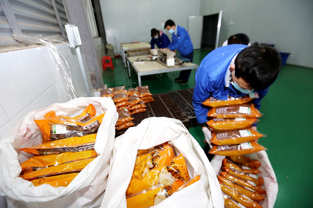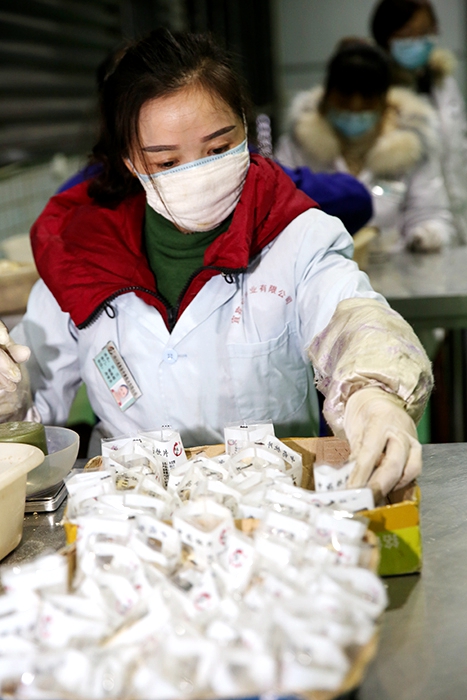 原料庫旁邊,就是藥品包裝車間。車間內,工人們正戴着口罩,有條不紊地打印中藥包裝袋、將中藥稱重裝袋、將已裝袋的成品打包。天花粉、金銀花、連翹等清熱解毒的中藥飲片,在工人們的流水作業中一一變成成品,及時供應宜賓市內及部分市外所需。