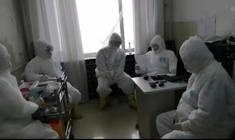 梯隊成員穿着防護服,帶着防護鏡,鏡片上全是哈氣,書寫過程非常費力,有的時候患者人多,工作量特別大,但沒有一個抱怨喊苦喊累的,這讓韓基生很欣慰也很心疼。梯隊成員大都很年輕,最小的護士才20歲,他經常對她們進行感控防護知識培訓,由於新冠肺炎病情突發,病毒也是以前未知的新型病毒,權威部門的診療方案和判斷標準也隨時修訂更新,他都及時的同梯隊成員進行解讀。
