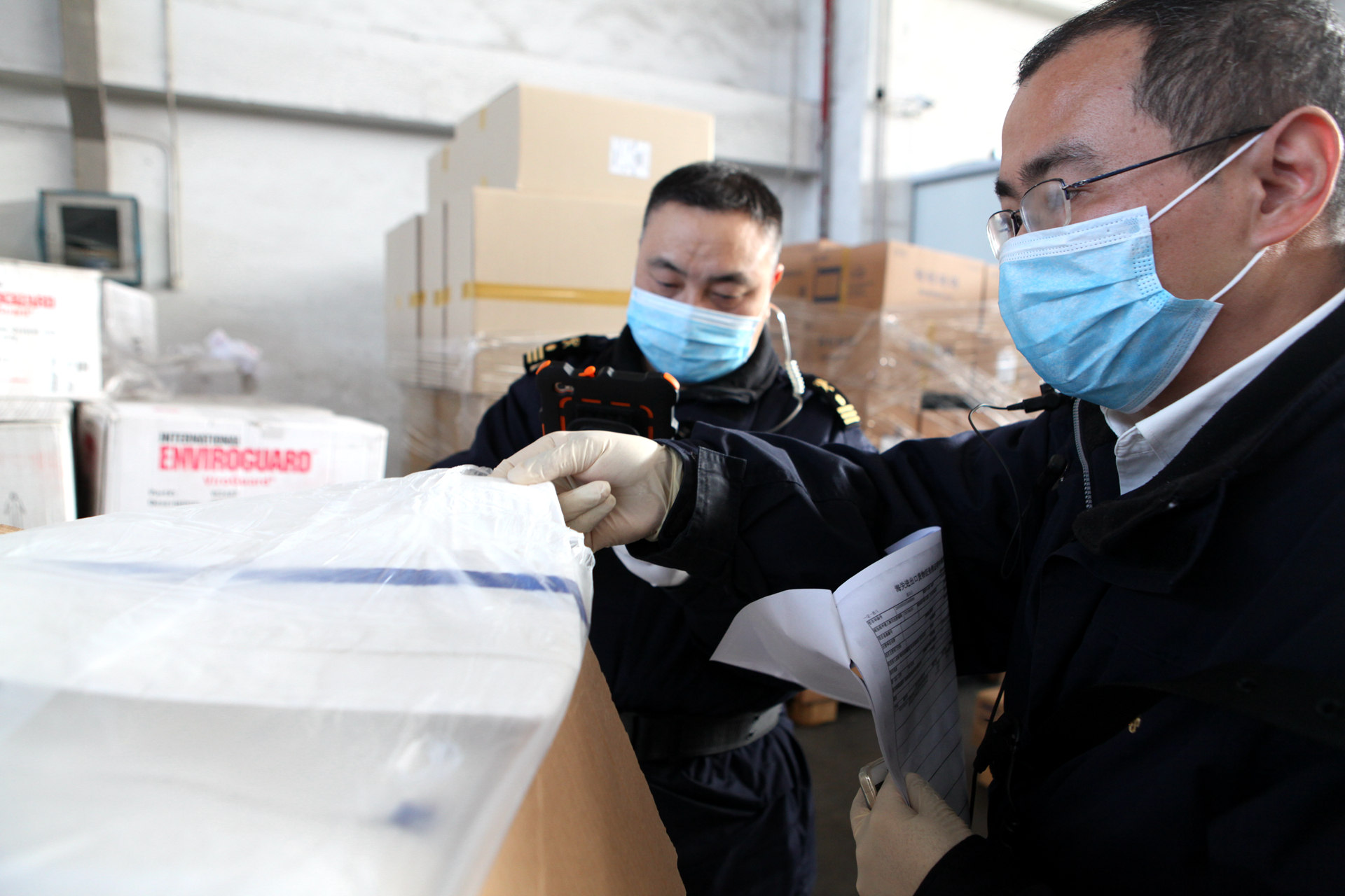 2250件進口捐贈醫用防護服在南京海關隸屬祿口機場海關快速通關放行(劉潔 攝)