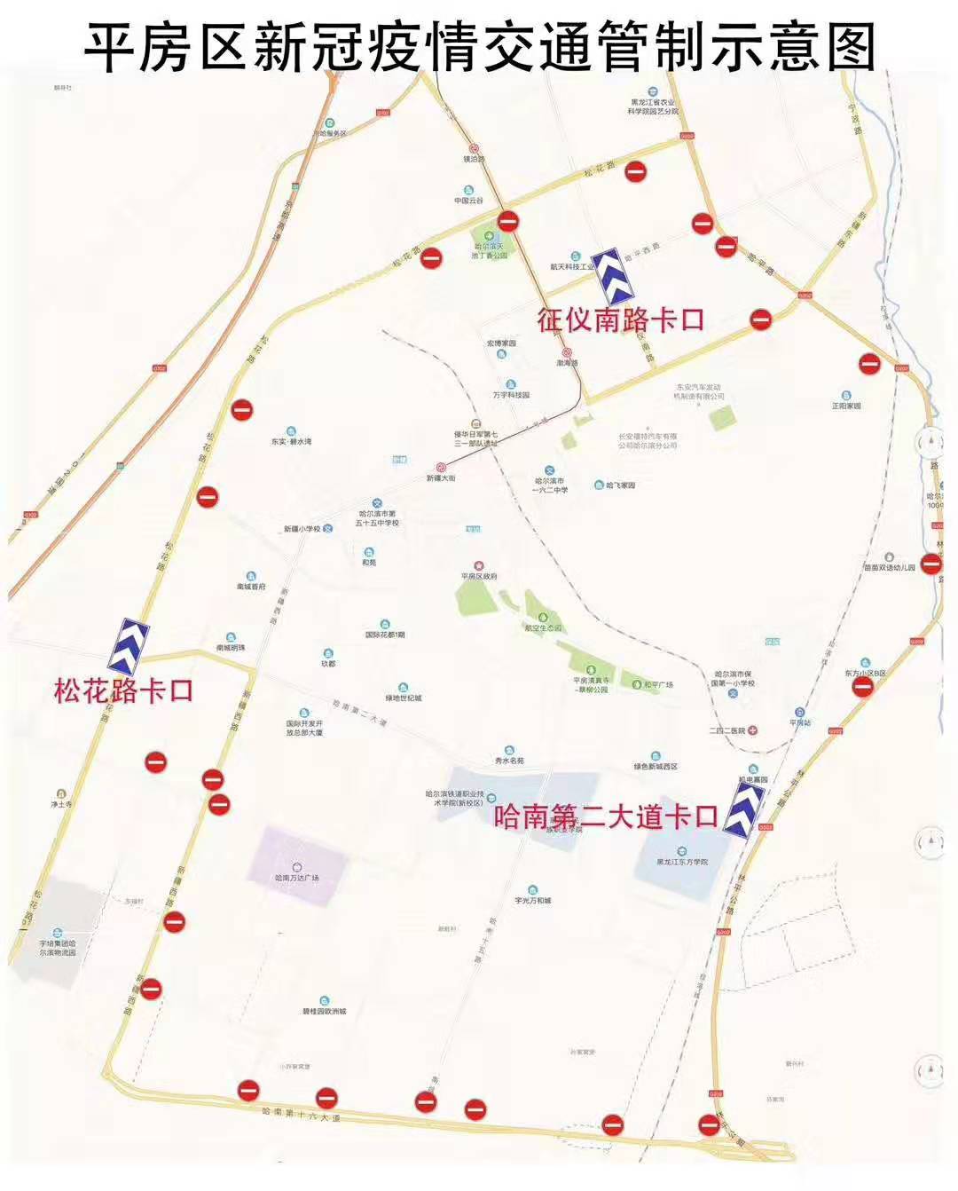6日7時30分起,區城管局、區交警大隊、公安分局在區屬各重要路口聯合開展交通管制。在哈平西路與征儀南路交口、哈五路與向東街交口、新疆西路與雲谷大道交口等35個道路交口設封閉卡點,實行物理隔離和設卡管理。工作人員對來往機動車和電動車進行疏導勸返管理,做到嚴防死守。除35個封閉卡點外,在征儀路與哈平西路交口、松花路與哈南第二大道交口、哈南第二大道與聯盟大街交口設置了3個通行卡口,參與疫情防控、醫療救護、生產生活保障、應急管理和運輸醫療物資、群眾生活物資的車輛憑車輛通行證放行,用以保證全區疫情防控工作和正常生產生活。