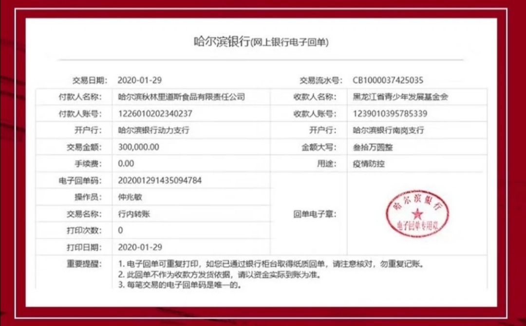 據了解,1月26日、31日,哈爾濱秋林里道斯食品有限責任公司相繼向湖北省捐贈32萬元人民幣,用以支援武漢抗擊肺炎疫情。款項將用於武漢及其周邊地區的新型冠狀病毒感染肺炎疫情的抗擊及防治工作,包括採購口罩、消毒液、護目鏡、呼吸機等疫情應急物資。2月1日,又為奮戰在一線採訪的新聞工作者捐贈N95口罩,用於前線報道。