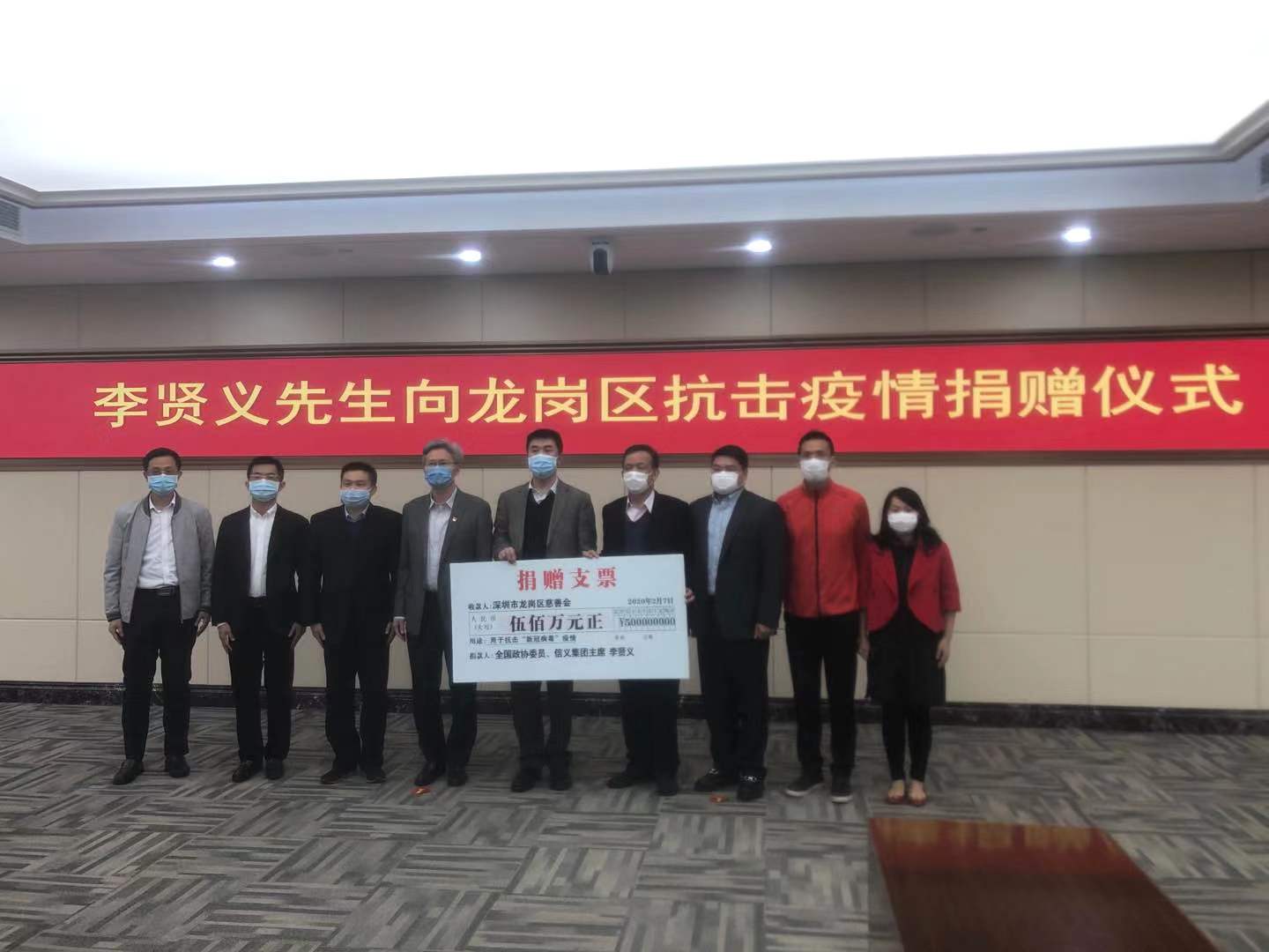 【香港商報網訊】記者 朱開芝 報導:2月7日下午,深圳市龍崗區政府區長代金濤代表政府接受了來自信義集團李賢義先生捐獻的善款500萬元。據悉,該款項將專門用於龍崗區疫情的處置和救助。