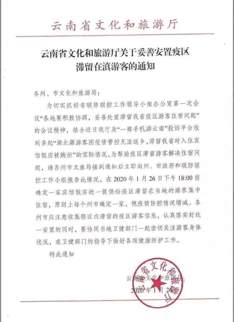 雲南省《關於妥善安置疫區滯留在滇遊客的通知》