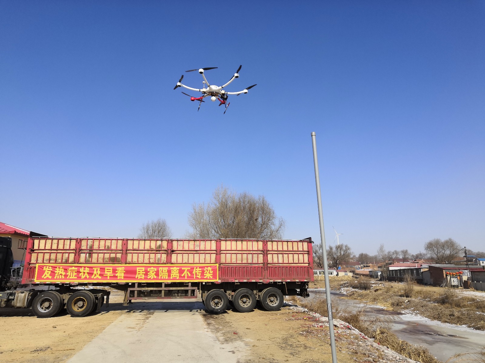 伴隨着一陣嗡嗡聲,兩架載有消毒藥劑的無人機在柏家溝劉大溝村上方飛過,無人機身懸着疫情防控宣傳條幅,將消毒藥劑噴洒在柏家溝鎮劉大溝村的每個角落。