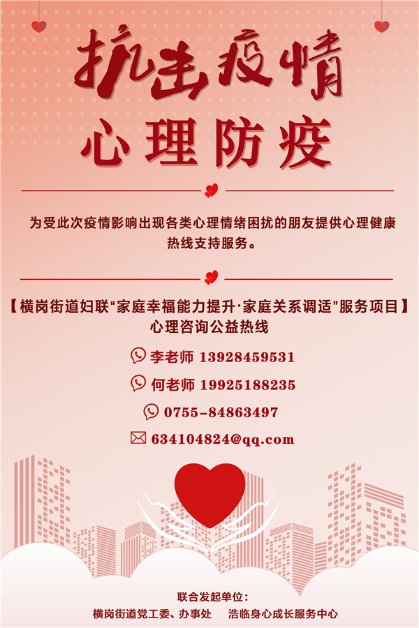 橫崗街道婦聯相關負責人表示,開通心理援助熱線這一舉措是考慮到當下疫情防控的特殊時期,希望能為社區居民提供危機干預、心理健康支持等服務,通過「一對一」的心理諮詢,幫助他們找到心結、減輕焦慮,引導居民用積極健康的心態合力抗擊疫情。有需要的居民可以撥打:13928459531(李老師)、19925188235(何老師)、0755-84863497(固定電話)直接向老師尋求幫助。(朱開芝 彭東伊)