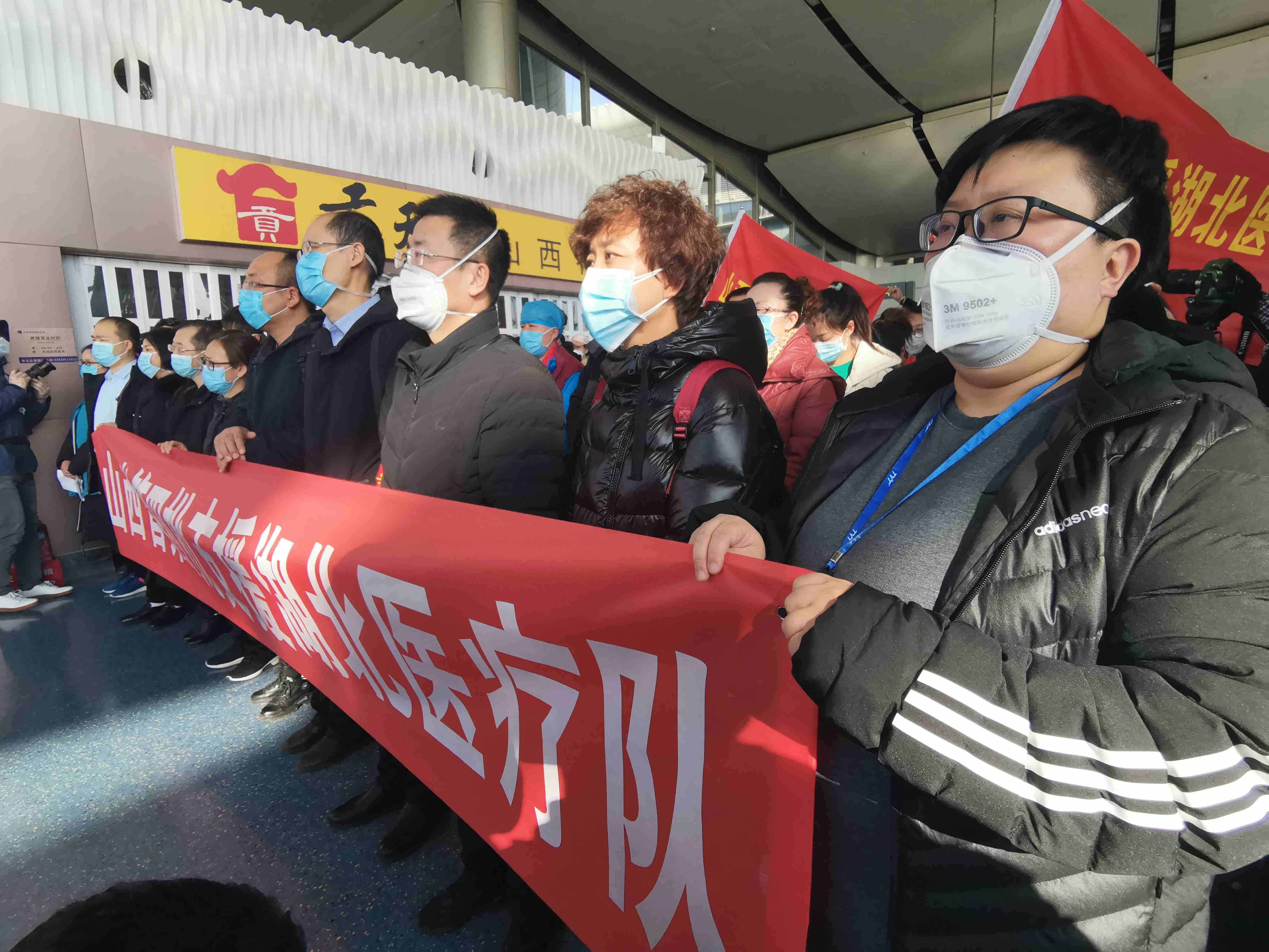 據悉,山西省第四批支援湖北醫療隊來自山西11個地市,由部分委直醫院、市級、區縣級基層醫院抽調組成,他們攜帶醫用物資和藥品緊急集結到太原,並於9日下午3點,分別搭乘兩架飛機分批飛往武漢。