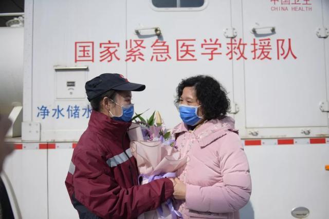 在出征儀式現場,一旁是出征隊員整裝待發,另一旁是家屬、同事、朋友的依依不捨。