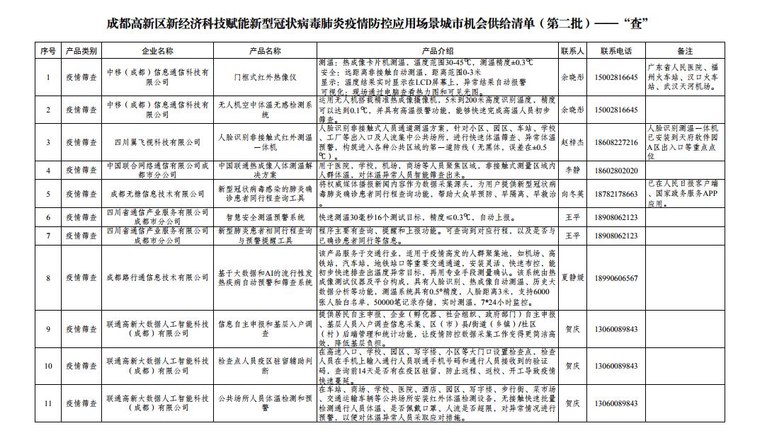 「首批清單發佈後,很多企業都反映社會對接積極、反響熱烈,近期我們收到了越來越多的企業信息,因此在首批26家企業49種產品基礎上新增了很多內容,」成都高新區新經濟發展局相關負責人表示,將以最快速度梳理企業產品信息,持續發佈城市機會清單,向社會各界提供更多疫情防控相關物資及技術服務。