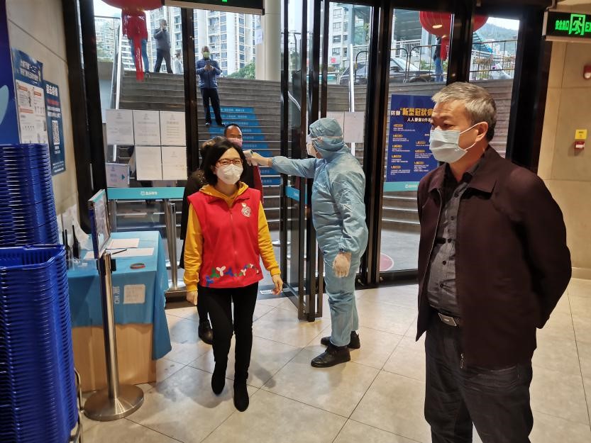 商場工作人員在出入口測體溫
