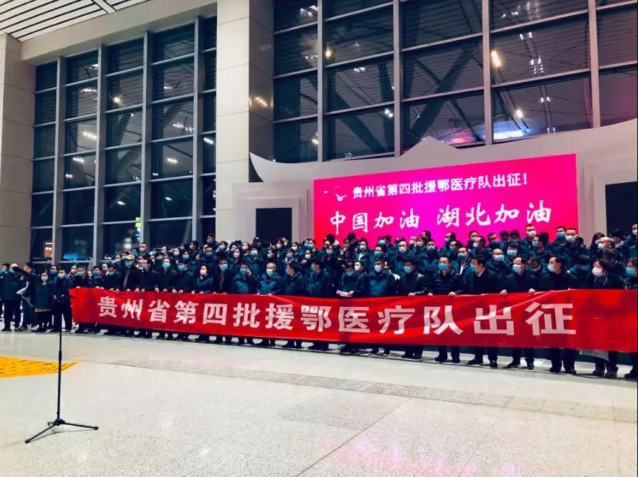當晚8時許,貴陽龍洞堡國際機場二樓出發大廳,集結等待出發的醫療隊隊員個個裝備整齊、士氣高漲。貴州省委書記、省人大常委會主任孫志剛發表講話,深情囑託大家說,你們參與的是習近平總書記親自領導、親自指揮的疫情防控阻擊戰,任務艱巨、使命光榮。當前,這場抗擊疫情的阻擊戰已到最關鍵時刻,一方有難、八方支援,湖北人民有難,貴州人民責無旁貸。你們奔赴最前線,代表的是貴州人民的形象、肩負的是貴州人民的重託。要始終牢記習近平總書記殷殷囑託,在黨中央的堅強領導下,與當地多溝通、多商量,竭盡全力救治病人,堅決打贏這場阻擊戰。大家奔赴第一線,貴州人民是你們強大的後盾。大家要保護好自己,保護好自己就是保護戰鬥力、增強戰鬥力。湖北人民期盼你們戰勝病魔,貴州人民期盼你們凱旋而歸。祝英雄的貴州兒女出師順利!