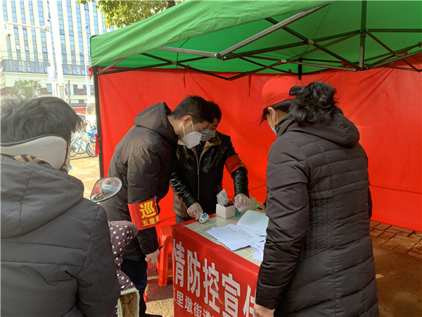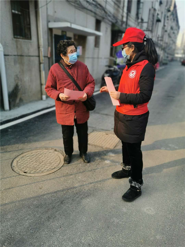 蜀山區民政局工作人員下沉到社區參與防疫宣傳,向群眾發放宣傳單