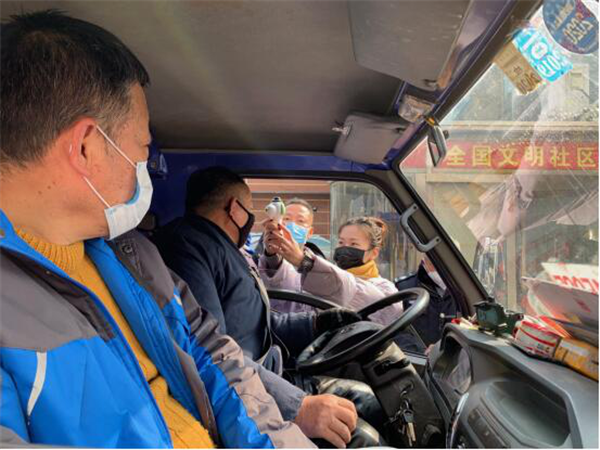 蜀山區委組織部工作人員在三里庵街道竹蔭里社區協助做好進出人員體溫檢測工作