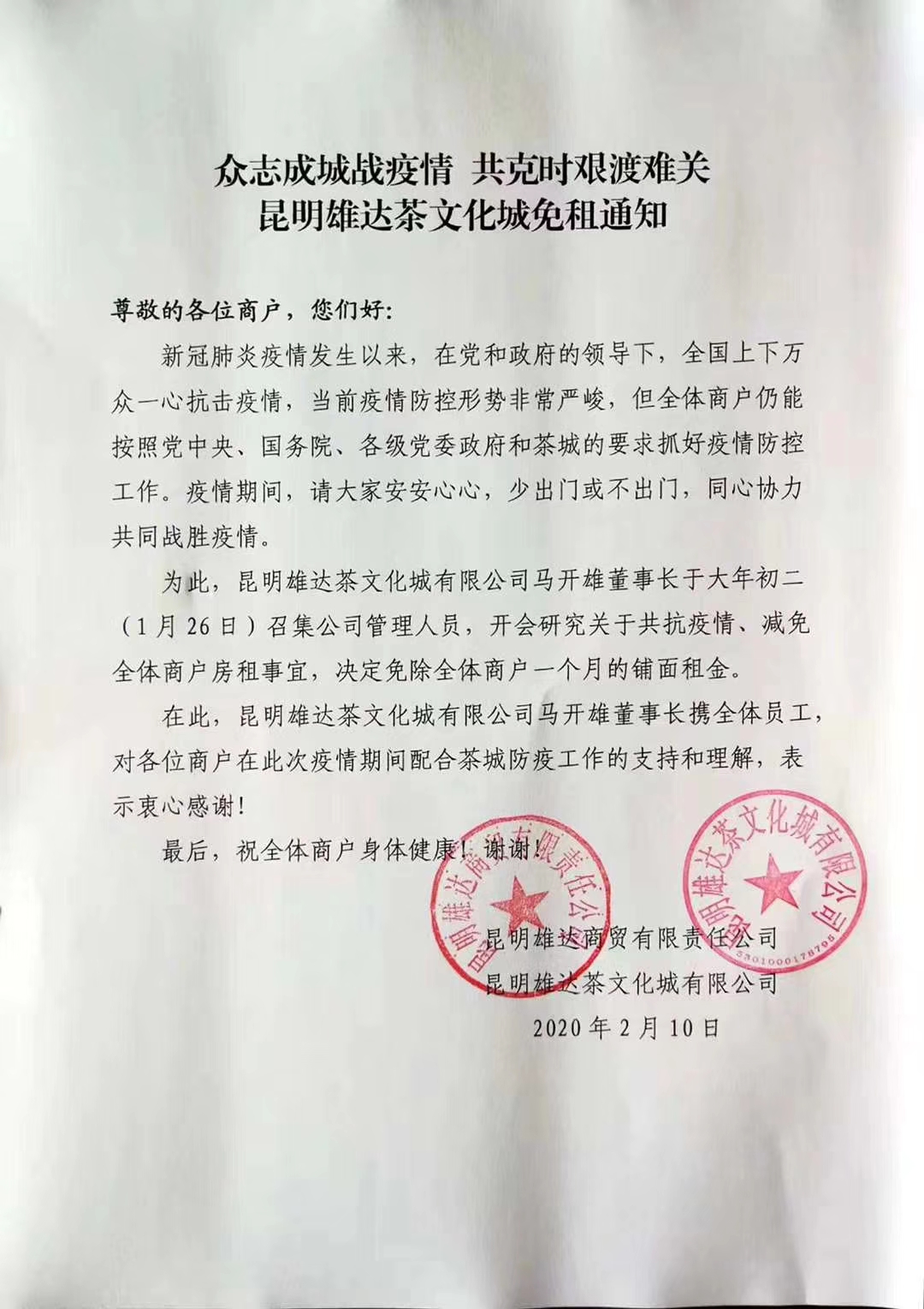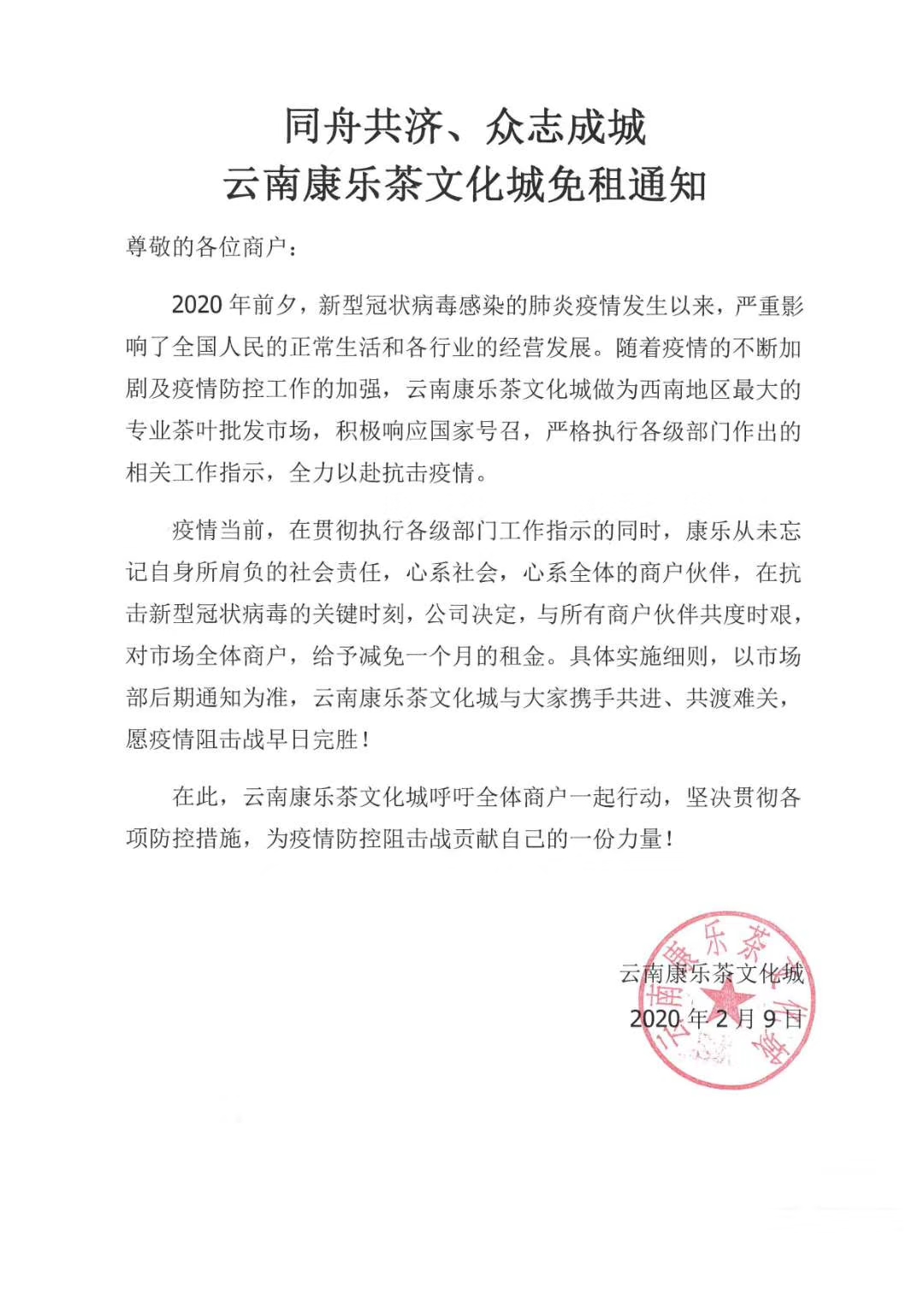 【香港商報網訊】記者 劉曉寒 報導:「眾志成城戰疫情,共克時艱渡難關」,2月9日、10日,雲南康樂茶文化城與昆明雄達茶文化城相繼貼出免租通知,免除全體商戶一個月的鋪面租金。