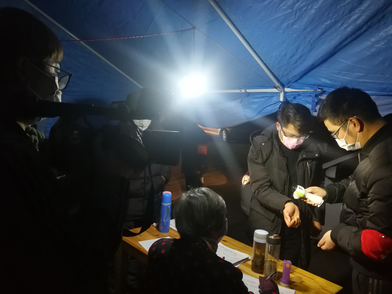 晚上九點,記者又連夜驅車20多公里來到陳霞鄉小珰村卡點。在這裏看到,該鄉主要領導帶隊和村支部夜間值班人員搭起帳篷,對這個卡點實行封閉式管理,只保留一個出入口,並實行“軟隔離”,認真做好外來車輛及人員登記排查解釋工作。