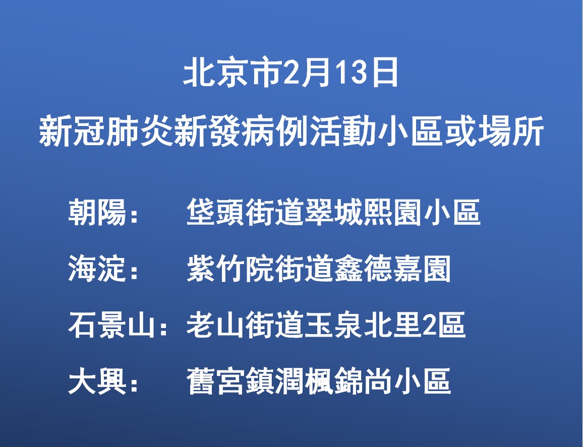 北京市疾病預防控制中心副主任龐星火發佈了2月13日新發病例活動過的小區或場所,具體信息如圖所示: