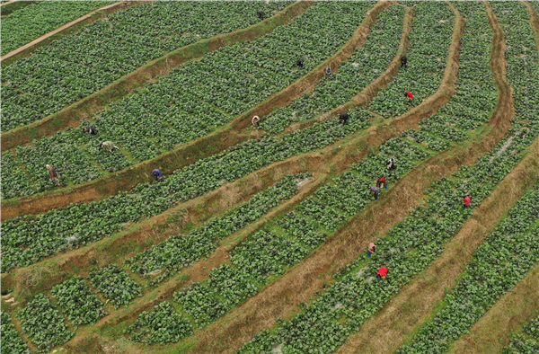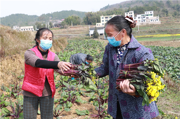 當日,在玉屏縣田坪鎮玉露村蔬菜基地上,當地政府在做好體溫測量、佩戴口罩等防疫措施的前提下,引導廣大農民加快紅菜苔的採收、包裝等工作,做到防疫與農忙兩不誤。