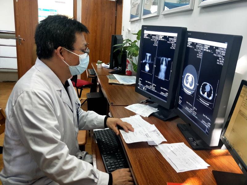 在防控新冠肺炎疫情期間,潘軍平除了負責醫院影像科日常的CT和DR病例診斷以外,還要肩負疫情防控臨床專家組的會診工作。潘軍平深知與發熱患者「零距離」接觸有多麼危險,但他始終視疫情如命令,每次科室有急診或者疑難病症患者做檢查,他都總是第一時間趕到現場,義無反顧地投身到疫情防控工作中,不分晝夜、隨叫隨到、毫無怨言。