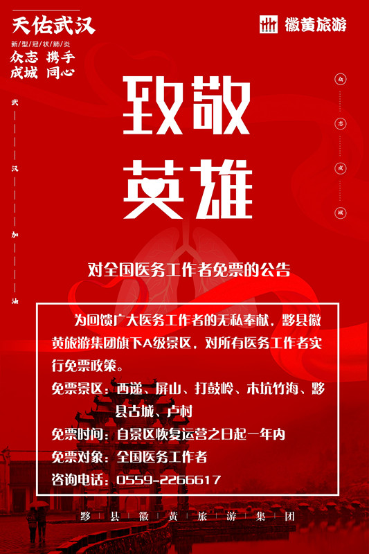 【香港商報網訊】记者 吴敏 報導:“山河無恙· 感恩有你”。2月15日,記者從安徽黃山市黟縣獲悉,為致敬醫務工作者,徽黃旅遊集團推出旗下A級景區對全國醫務工作者的“免費遊”政策:自景區恢復運營之日一年內,全國醫務工作者憑有效證件(醫師證、護士證或與醫務工作相關的其他資格證件,可免費遊玩西遞、屏山、盧村、木坑竹海、打鼓嶺、黟縣古城等景區景點。