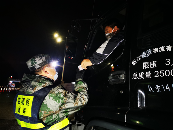 “你好,請配合測個體溫。你們是哪里過來的?”當天晚上11點半,記者又探訪了屯溪二號高速口。來自屯溪區的醫務人員和民兵志願者同樣堅守在崗,對一輛快遞運輸車的司機測量體溫,詢問登記車輛相關資訊。“這個時候車輛雖然很少很少,但是我們不能離開崗位,車子隨時會來。”正在值守的醫務人員孫馬強表示,降溫會辛苦一些,但是政府為他們準備了防寒保暖物資,愛心人士還送了暖寶貼,心裏很暖。