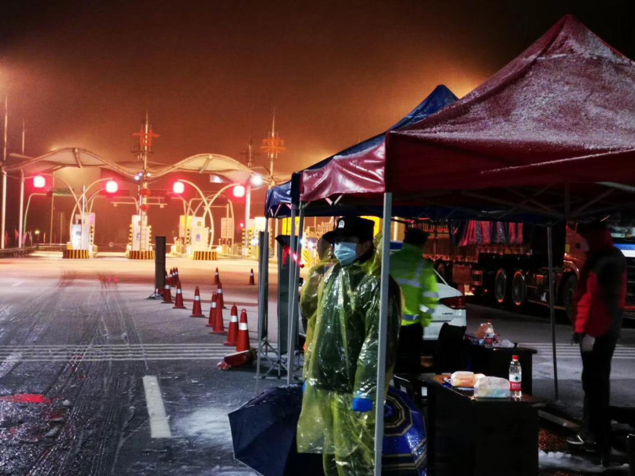 與鄉鎮一樣,黃山區城區的22個卡點的執勤人員,也全部在崗線上。他們是甘棠鎮的民兵、鎮幹部和社區志願者。因為雨雪到來,路面結冰,各卡點的同志在做好測量體溫、檢查記錄的同時,還要提醒駕駛員小心駕駛。“現在是關鍵時期,出門記得佩戴口罩,雨雪天沒事儘量少出門,多關注官方發佈信息……”臨時搭起的各個夜間防疫卡點帳篷處,大家不畏嚴寒,做到“不漏一人一車”,一個個忙碌的身影,一句句暖心的話,成為這個風雪天氣裏最溫暖的守候。