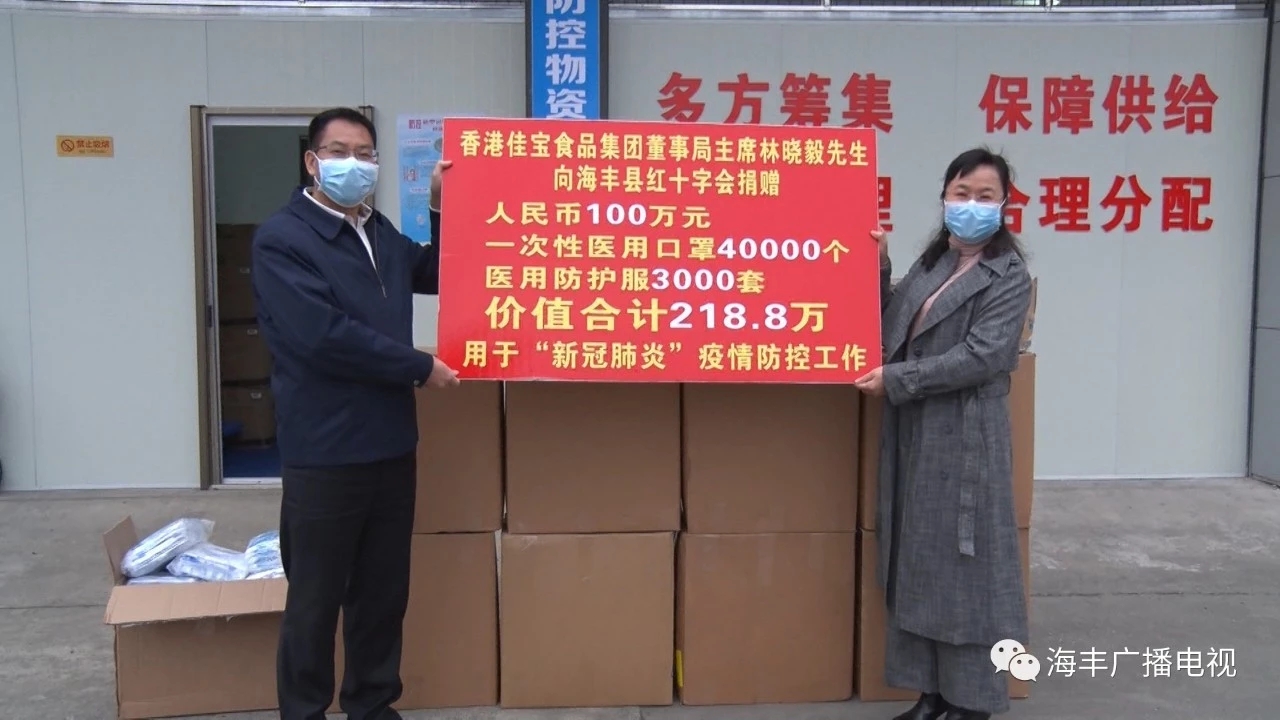 【香港商報網訊】2月16日,海豐籍香港佳寶食品集團董事局主席林曉毅向海豐縣捐贈人民幣100萬元和一次性醫用口罩40000個、醫用防護服3000套等疫情應急防控物資,總價值218.8萬元,助力海豐疫情防控。