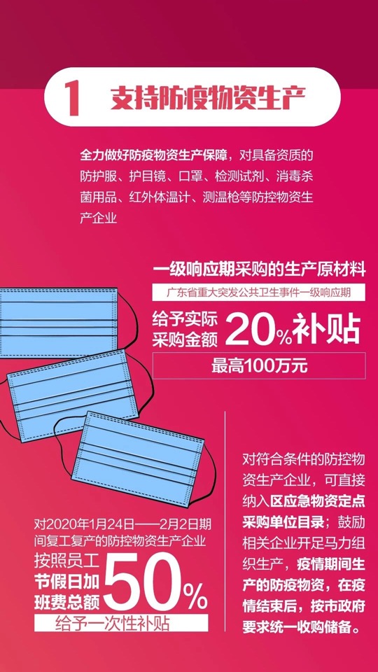 記者了解到,寶安出台的關於應對新型冠狀病毒感染的肺炎疫情支持企業復工復產和保障重大項目建設的若干政策措施涵蓋面全、支持力度大,為企業科學有序復工復產奠定了信心。如第一條「支持防疫物資生產」。自新冠肺炎疫情爆發以來,醫用防護物品、消毒物品等防疫物資嚴重短缺,為了幫助企業安全、穩妥地復工復產,根據市級應對疫情的扶持政策,對生產醫用防護服、護目鏡、口罩、檢測試劑、消殺用品等防控物資的企業,給予50%的設備購置補貼。為了和市級政策形成有效互補,針對防疫物資生產企業近期原材料價格上漲的問題,《若干措施》規定,對一級響應期間採購的生產原材料,按市級採購價格的20%,給予最高100萬元補貼。同時,對春節假期期間1月24日-2月2日復工復產、保障市場防控物資供應的生產企業,給予員工加班費總額50%的補貼。