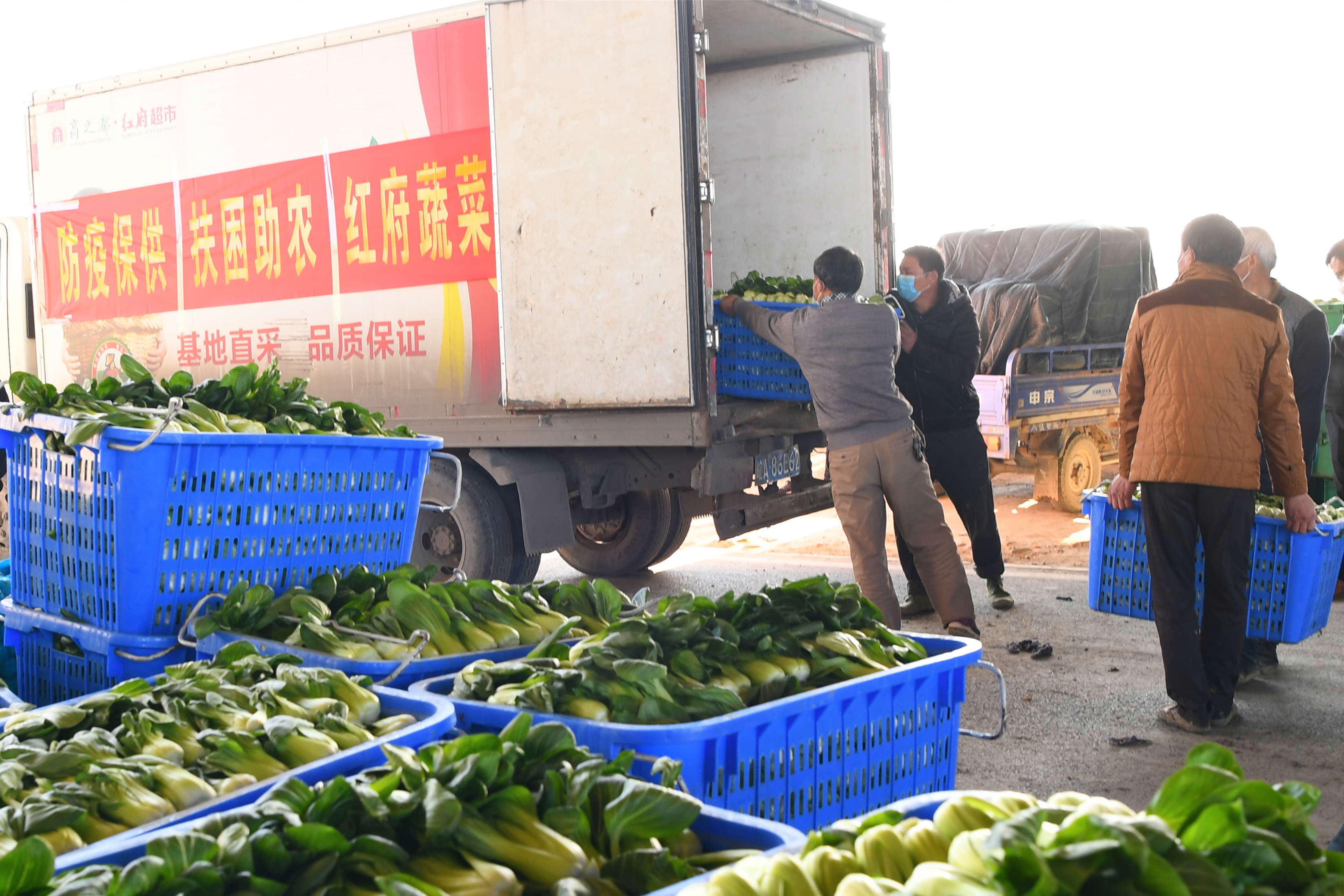 【香港商報網訊】2月17日,在合肥市包河區大圩鎮余墩村,3輛滿載着新鮮蔬菜的運輸車將6餘噸的蔬菜(上海青、顆白菜)送往市區紅府超市。此前,工作人員對場地及車輛進行消毒,菜農將剛採摘的蔬菜打包並簽訂菜品質量承諾書,登記後統一裝入超市運輸車中。