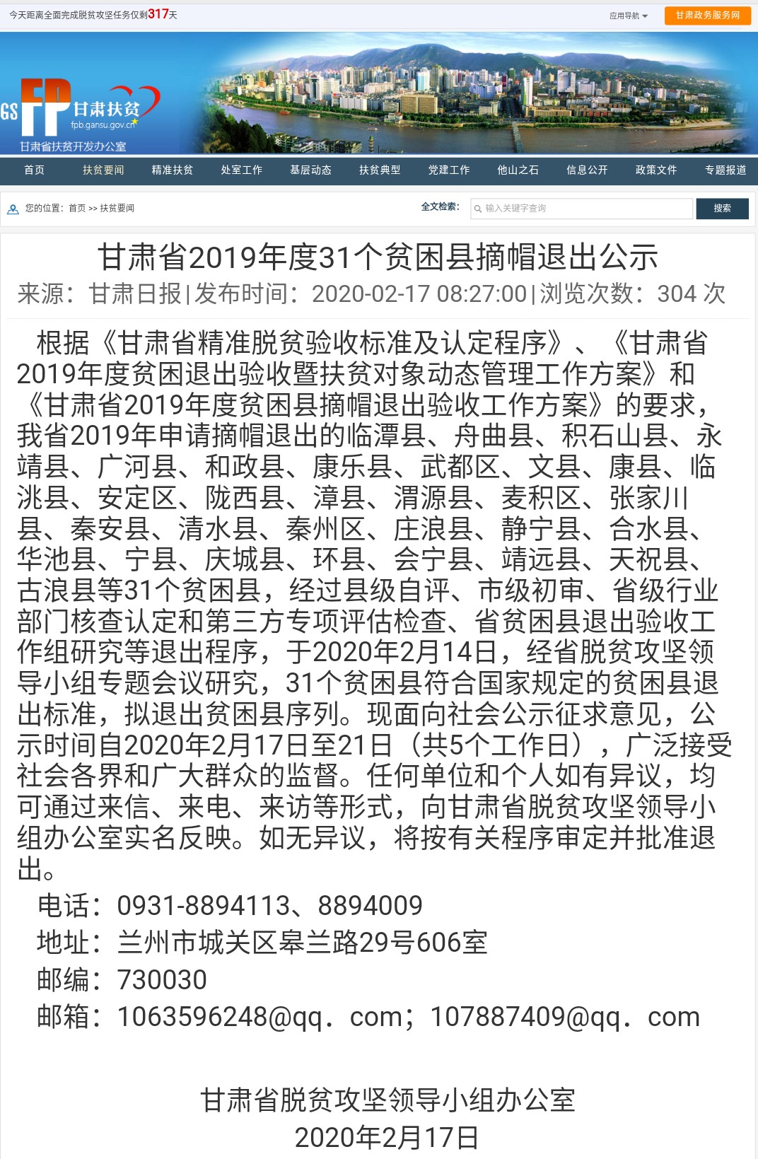 【香港商報網訊】記者 寇剛 報導:17日,甘肅省扶貧辦對2019年申請摘帽退出的31個貧困縣面向社會公示徵求意見,公示時間自2020年2月17日至21日(共5個工作日),廣泛接受社會各界和廣大群眾的監督。