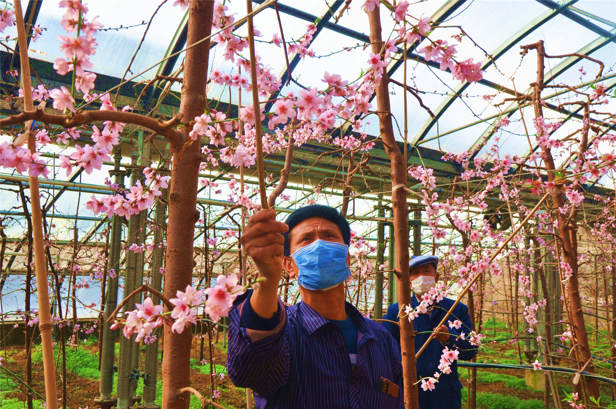 平谷大華山鎮溫室桃花盛開,桃農正在勞作