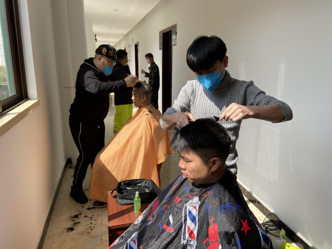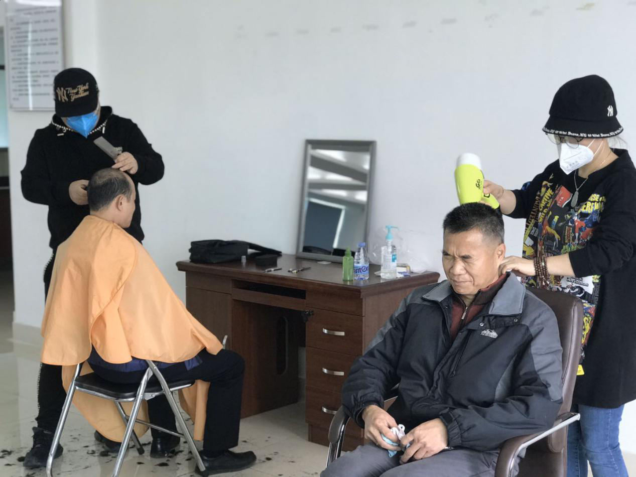 幾張凳子、一面鏡子、幾把剃髮刀,再用幾塊圍布就圍成了「流動理髮室」。因防護需要,理髮師們只能用噴水壼將他們的頭髮打濕,然後再細心打理。三個理髮師同時開工,一個個流星花園的主角「秒變」帥氣小伙。