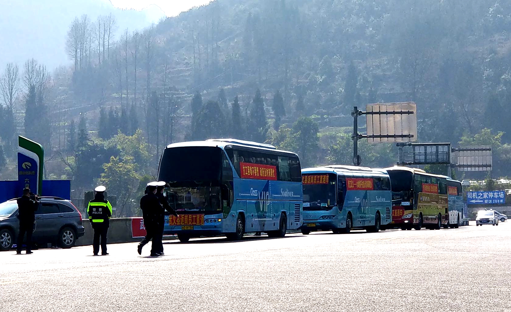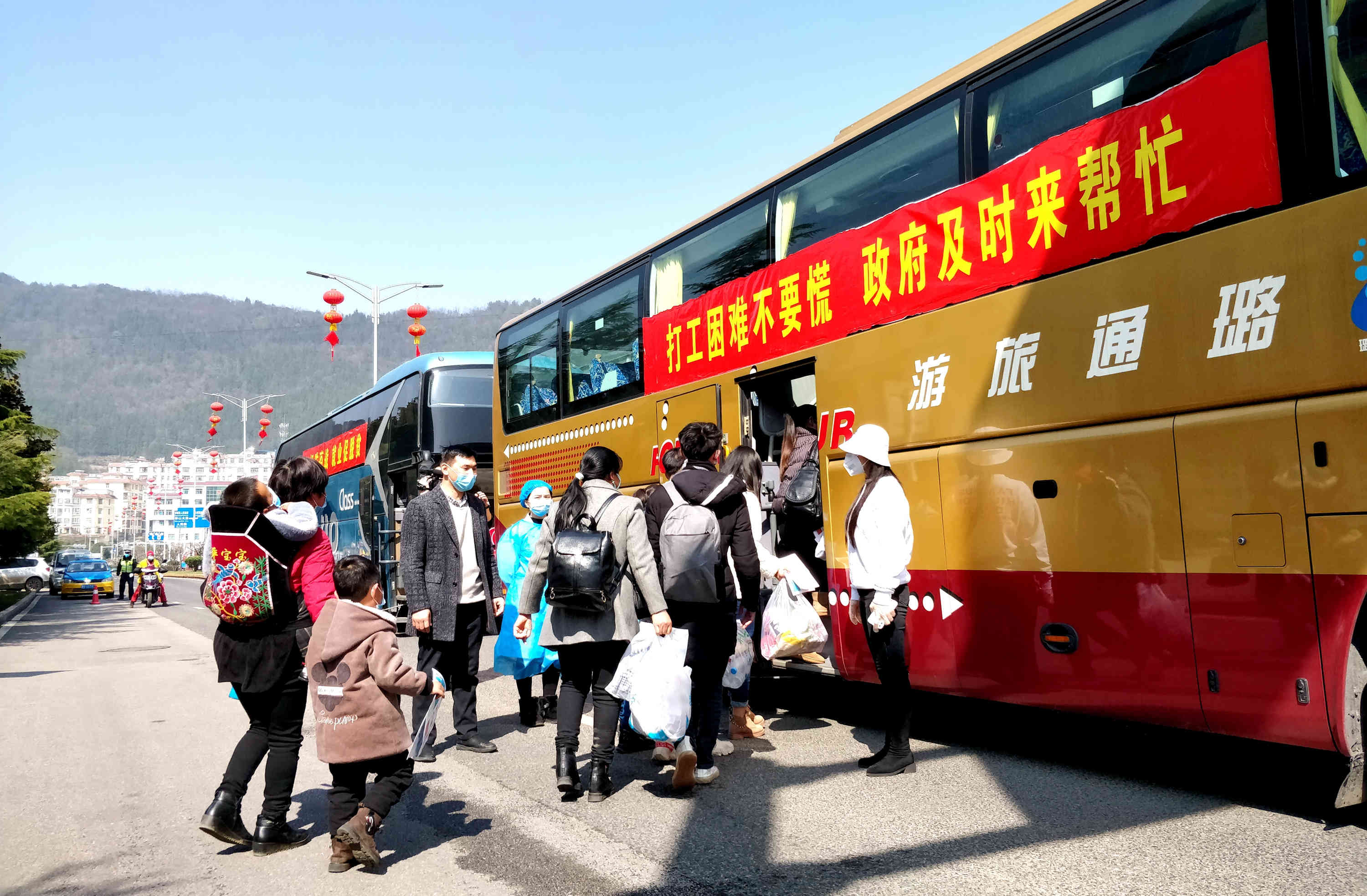此次集中返崗,浙江省武義縣組織車隊,橫跨1400多公里,專程趕到水城接水城籍農民工返崗。兩地人社部門專門制訂了組織運輸方案,細化運行線路、途中休息點等安排,嚴格對運輸車輛進行安全檢測和消毒,配備口罩、消毒劑、體溫計、常用藥品等防護用品,購買了飲用水、麵包、水果等物資,並由交警專門護送到省界收費站。