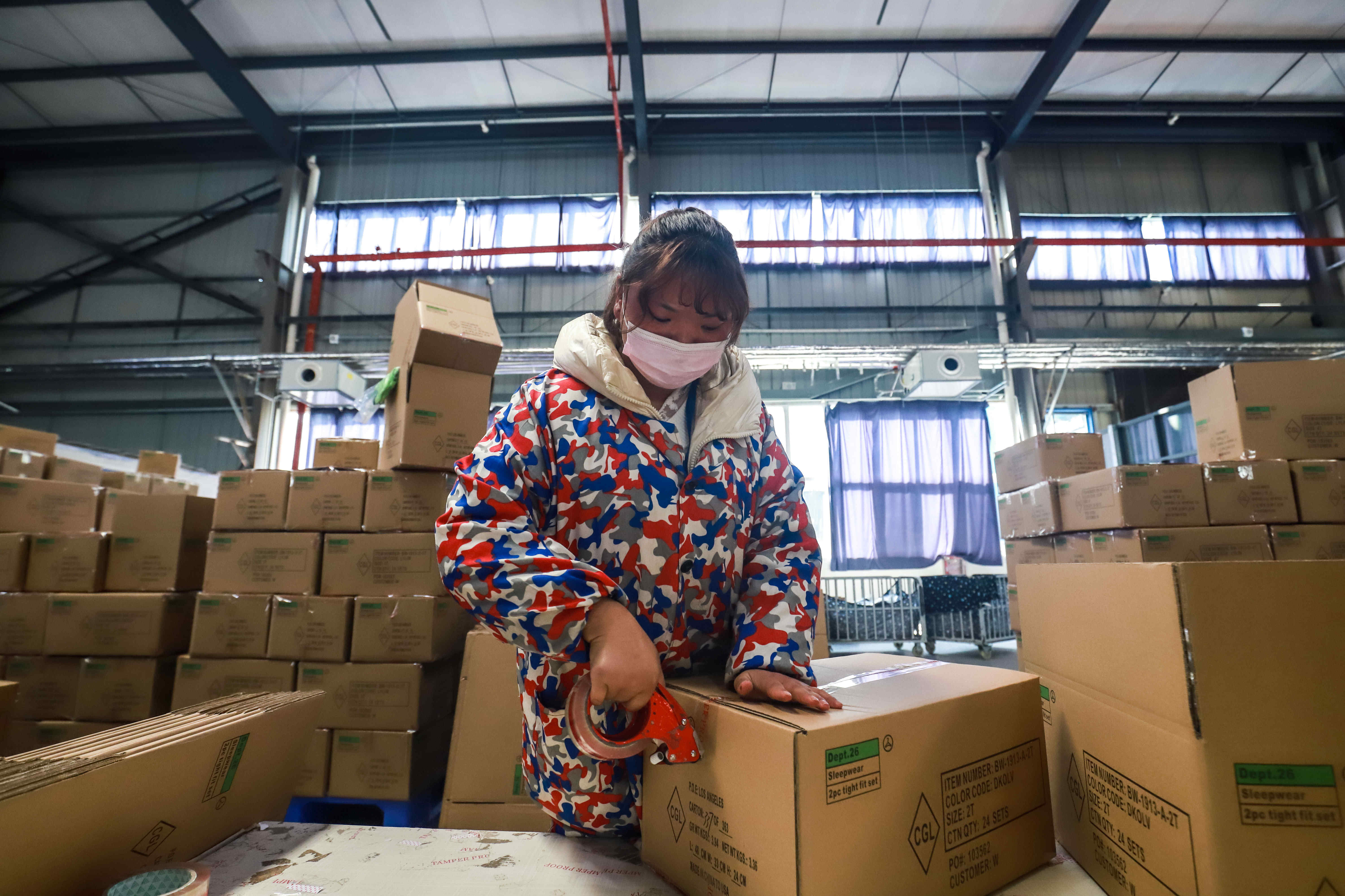 李春梅正在對製作完成的服裝打包裝箱