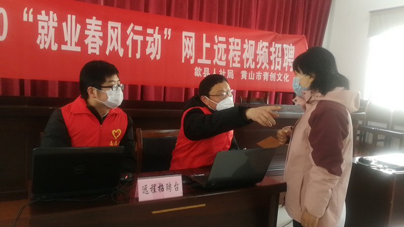 在網路遠程視頻招聘過程中,歙縣明確招聘活動分村、分時進行,並設置應聘區、等待區,防止人員規模聚集,參加應聘人員需戴口罩並持“用工服務卡”。