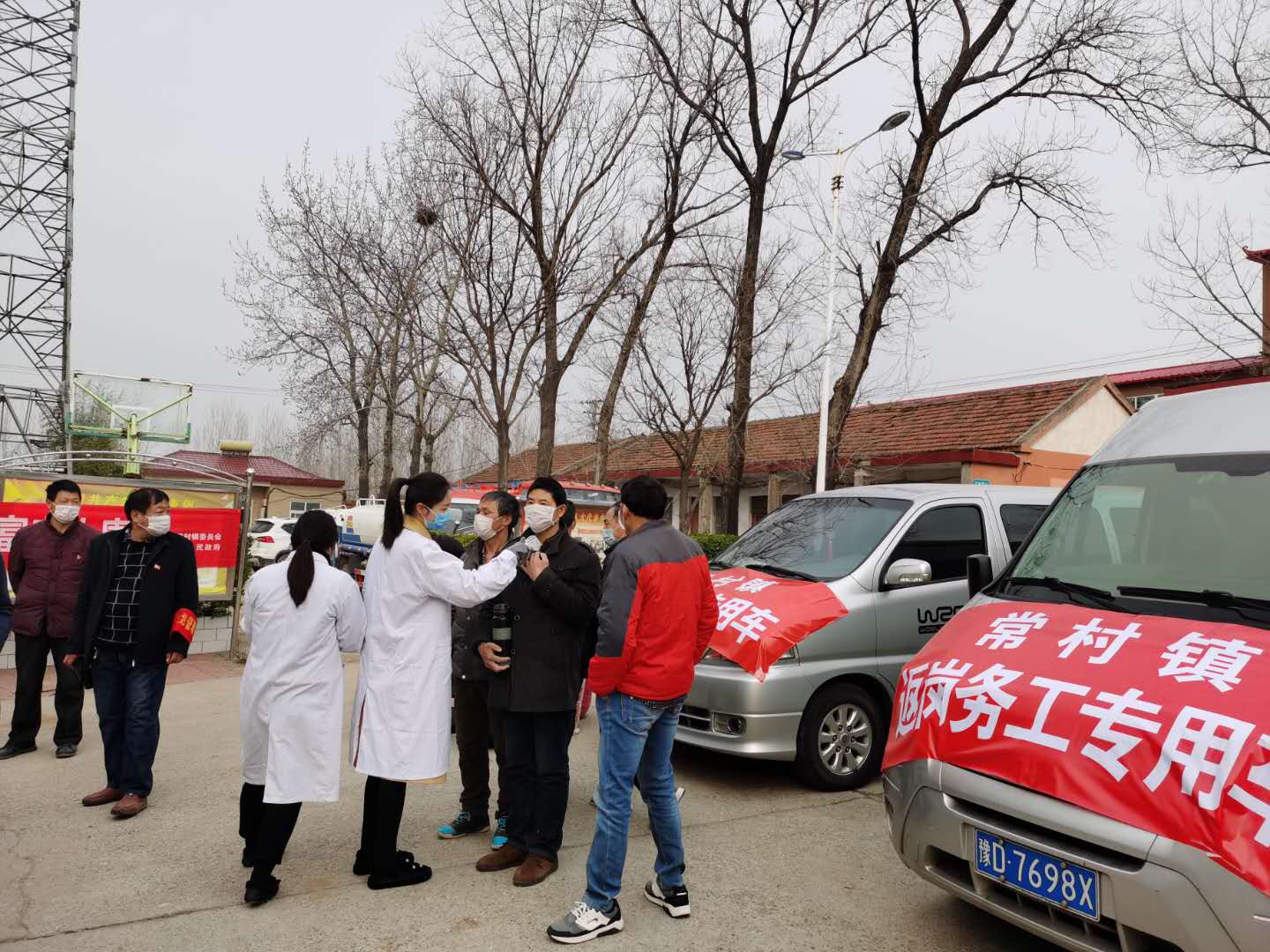 工作人員為外出人員測量體溫、辦理健康證明