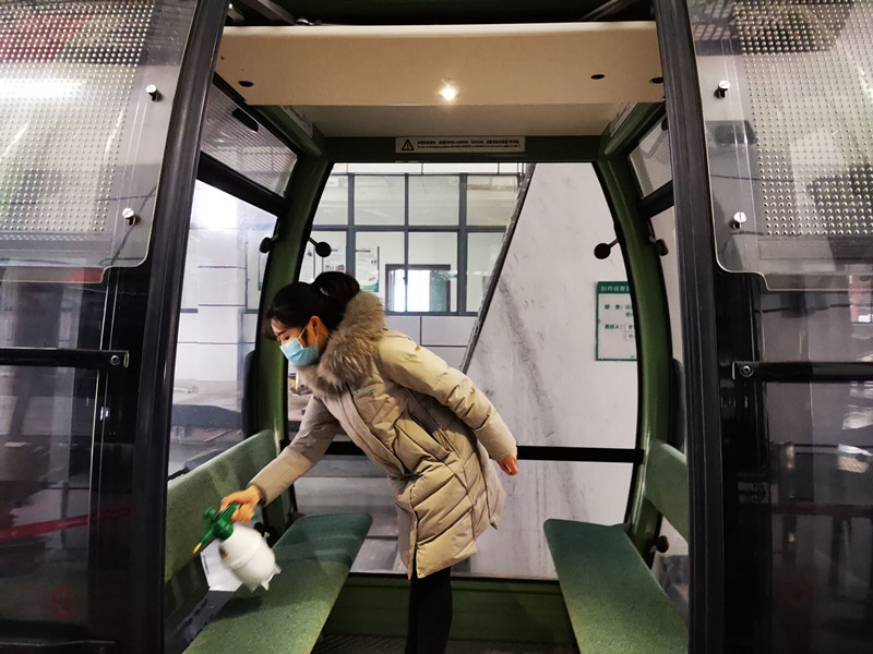 工作人員對索道車廂進行全面消毒 蔡季安攝