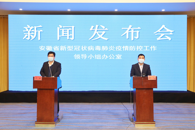 安徽省委宣傳部新聞發佈處處長武瀟(左)主持發佈會,東航安徽分公司副總經理陳小雄介紹相關情況並答記者問(劉煒鑫/攝)