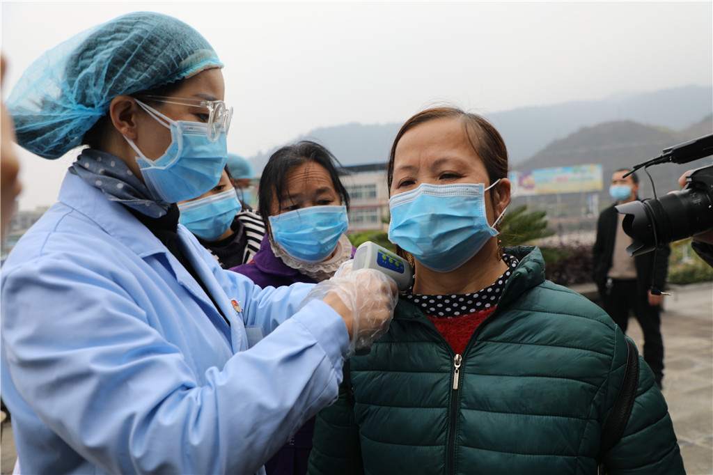 工作人員給外出務工人員測量體溫