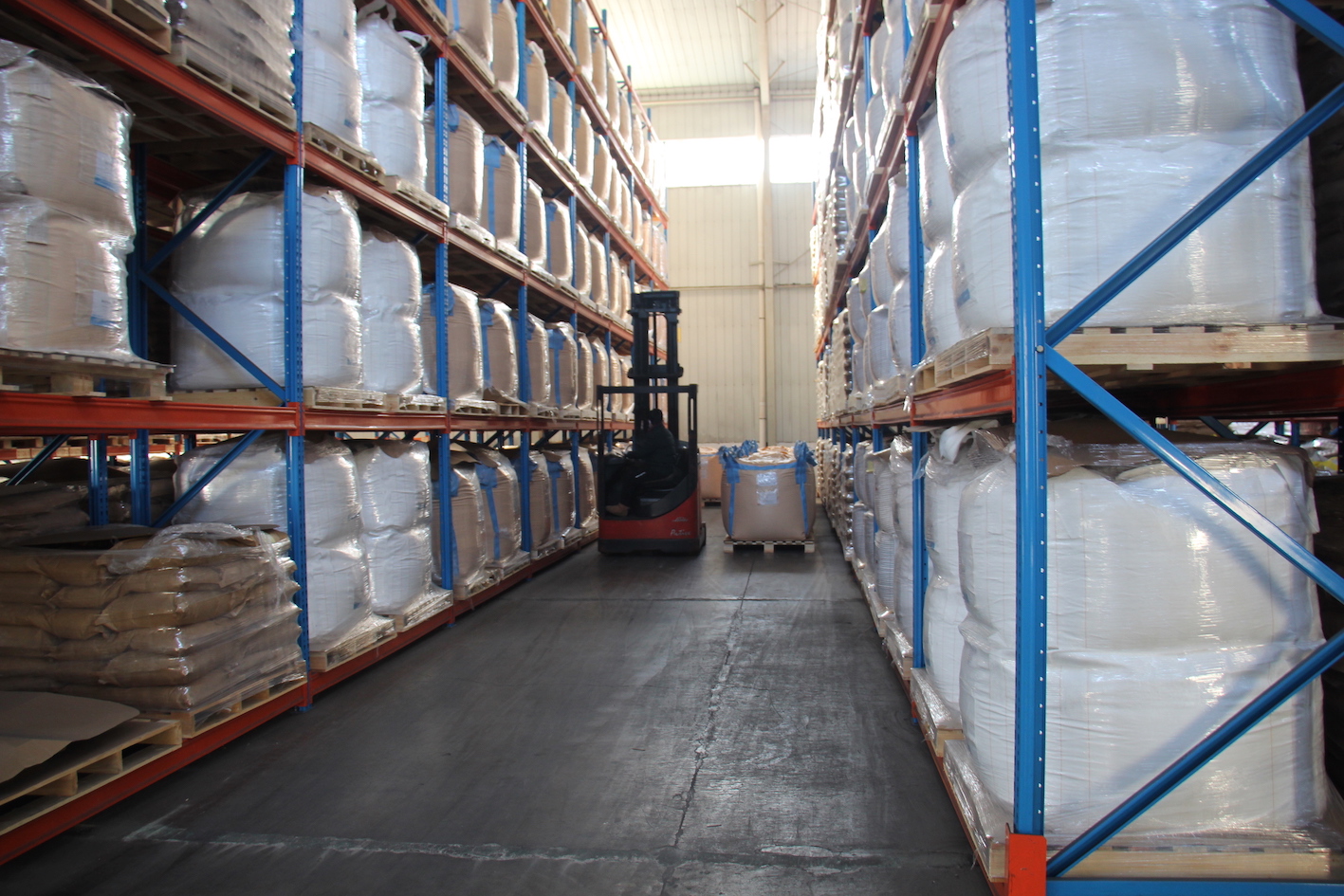 琅琊台集團衣康酸成品車間,員工正在用高位叉車進行產品的搬運纏膜