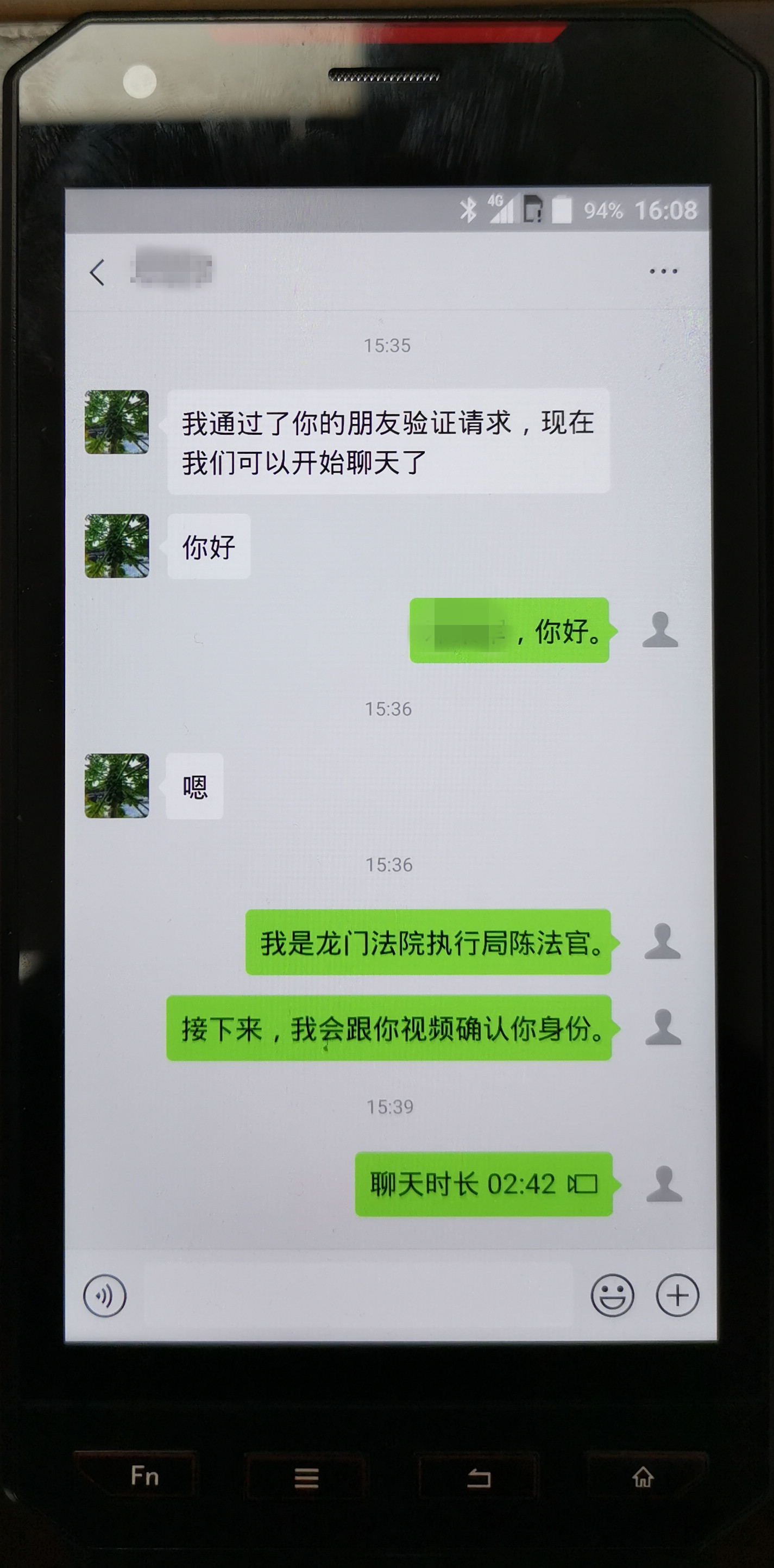 在疫情防控的非常時期,龍門縣法院執行法官陳法官實施網上執行,對涉案標的款予以凍結並扣劃,同時致電被執行人,向其釋法說理,該公司的相關負責人表示會積極配合法院的執行工作。隨後,陳法官致電申請執行人鄧某,向其說明相關情況。電話中,得知鄧某已回到江西老家,並有傷殘在身,需要後續治療,希望儘快領取執行款。考慮到疫情防控的需要以及當事人的身體狀況,陳法官跟鄧某電話溝通後,添加了鄧某的微信,通過微信視頻的方式確認他的身份與賬戶信息,並告知他在疫情防控的特殊時期,法院將通過線上轉賬的方式發放執行款,叮囑他在收到執行款後應及時將相關紙質材料寄回龍門法院。