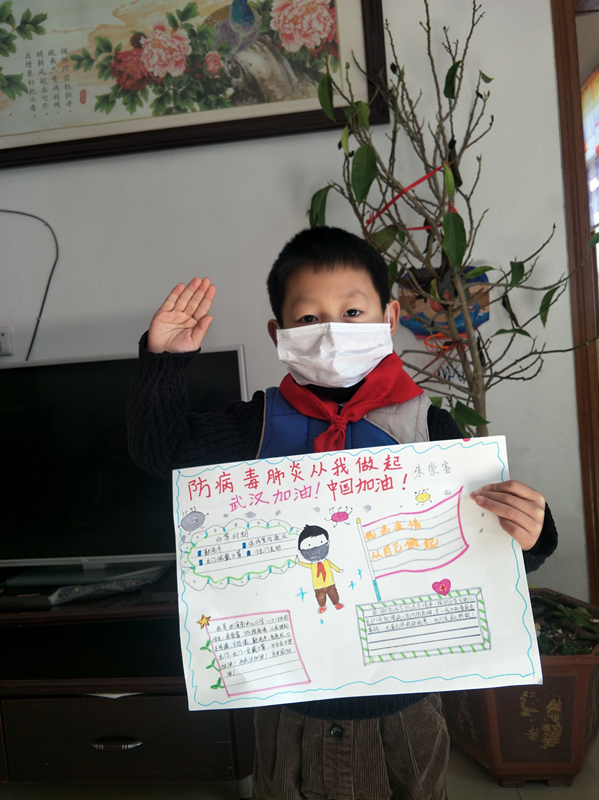 “你們奮戰在前線,我們就提供後方保障!”竦塘村眾愛心人士也紛紛傳遞愛心。其中,最小的捐贈者朱崇睿還只是個一年級的孩子,一心渴望加入少先隊員行列的他此時想也不想就捐出了一直捨不得買零食的100塊壓歲錢,小小年紀的他還認認真真地畫了一份手抄報,“武漢加油!中國加油!”這幾個大字在他的手抄報上顯得格外的醒目。