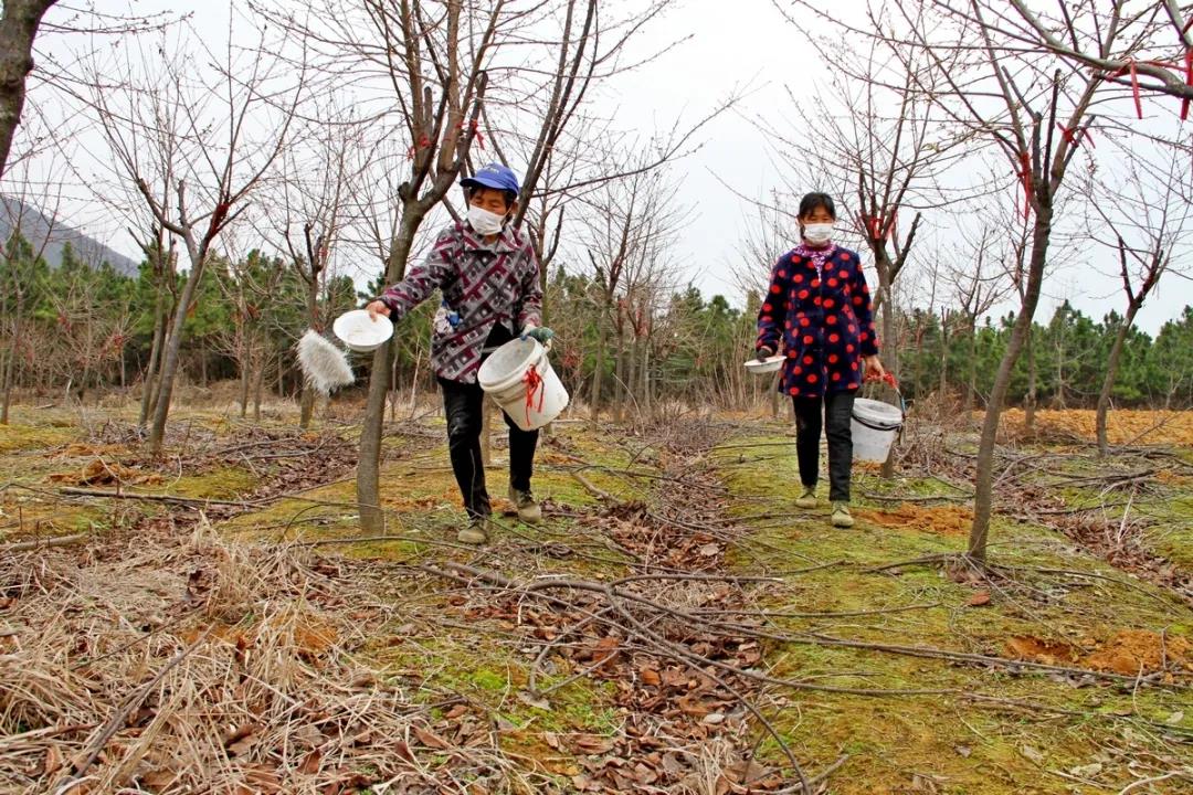 2月22日,巢湖市夏閣鎮獨山三花公園扶貧產業園裡,一些花期早的櫻花含苞待放,10多位村民忙着給櫻花樹施肥。作為村級幫扶聯繫人的獨山村黨委書記劉訓偉前往該處了解產業園復工復產情況。
